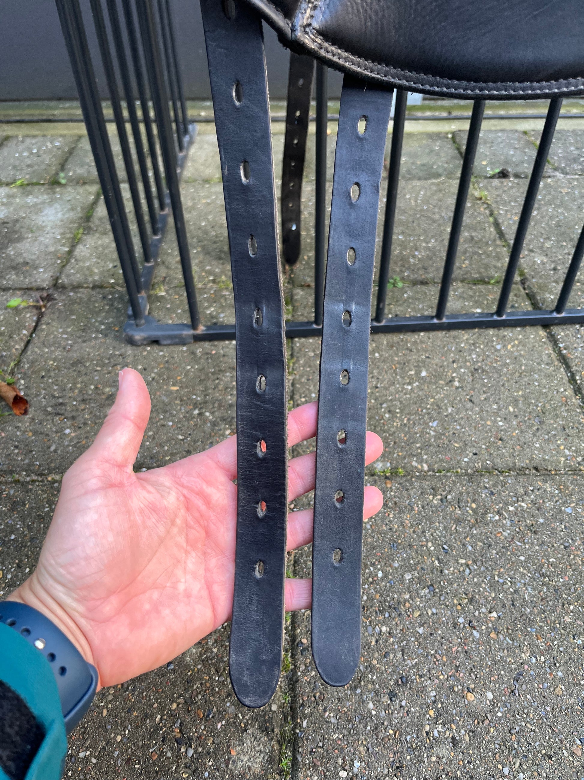 Karlslund B 17” sadel, 4 år gammel, virkelig velholdt sadel. Man sidder virkelig godt i den. Der medfølger gul, orange, rød og brun (er i pt) kofjern og sadelovertræk.