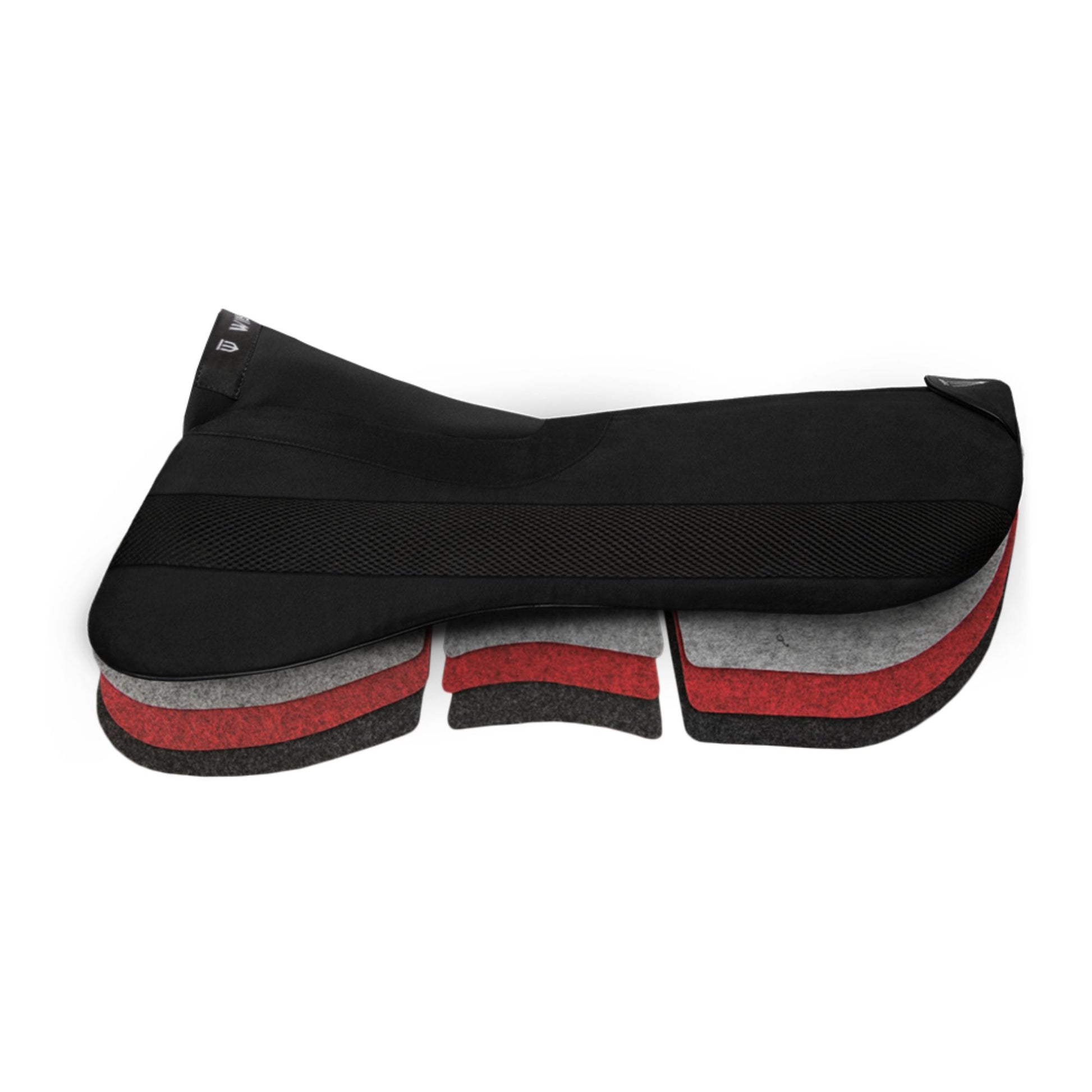 Dette Winderen halfpad har seks lommer til filtindsatser (i modsætning til konventionelle halfpads fire). Det blev designet i samråd med fysioterapeuter og dyrlæger for at matche de naturlige linjer i hestens rygmuskler. Brug af seks lommer til korrektionsindsatser (tre på hver side) muliggør en jævn og præcis placering af den nødvendige korrektion. Når du har brug for en rigtig stor korrektion, for eksempel 9 mm / 0,35 ”, kan du bruge et mindre antal indsatser i den midterste del af puden: for eksempel 4 mm / 0,16” til at danne en blid kil, og dermed undgå et skarpe kanter/fald.